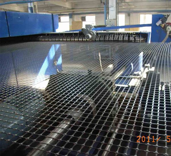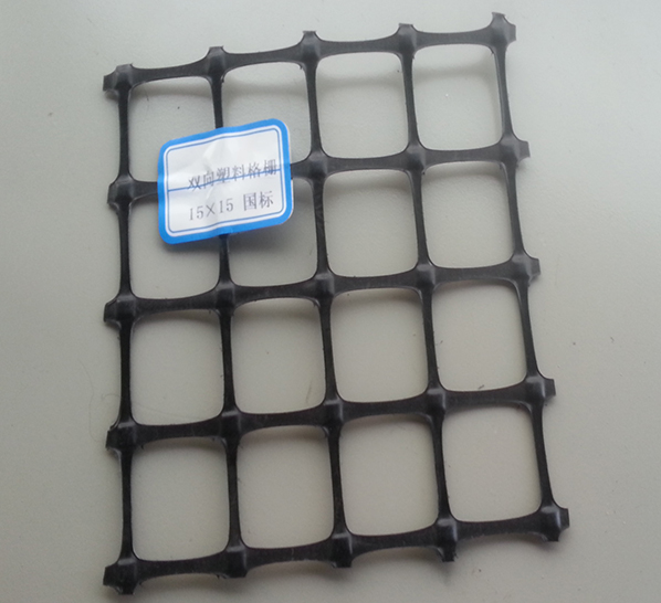 双向拉伸塑料土工格栅是以聚丙烯(PP)或聚乙烯(PE)为原料,经塑化挤出板材、冲孔、加热、纵向拉伸、横向拉伸而成。该材料在纵向和横向上都具有很大的拉伸强度,这种结构在土壤中能够提供一个更为有效的力的承担和扩散的理想连锁系统,适应于大面积承载的地基补强。