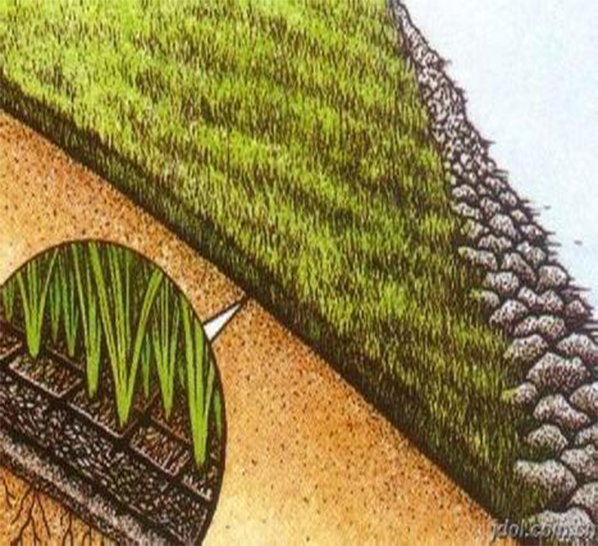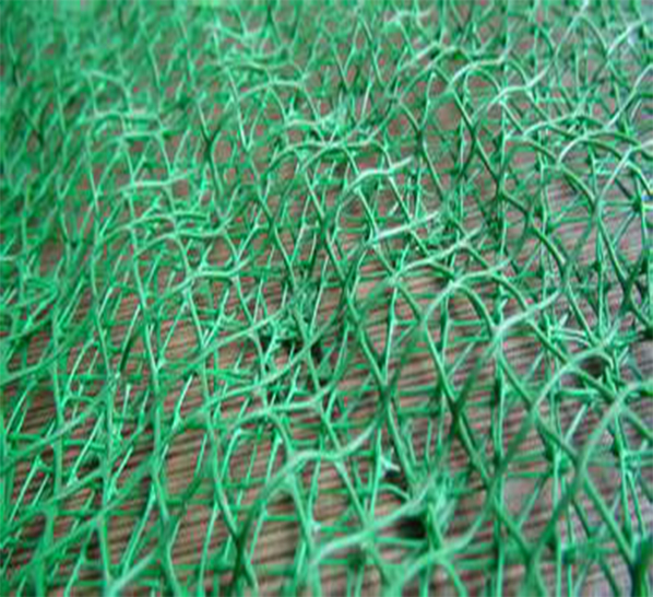 三维植被网是以热塑性树脂为原料,采用科学配方,经挤出、拉伸等工序精制而成。它无腐蚀性,化学性稳定,对大气、土壤、微生物呈惰性。该产品底层为一个高模量基础层,采用双向拉伸技术,其强度高,足以防止植被网变形,并能有效防止水土流失。表层为一个起泡层,膨松的网包以便填入土壤、种上草籽帮助固土,这种三维结构能更好地与土壤相结合。在边坡防护中使用三维植被能有效地保护坡面不受风、雨、洪水的侵蚀。该产品功能是有利于植被生长。随着植被的形成,它的主要功能是帮助草根系统增强其抵抗自然水土流失能力。