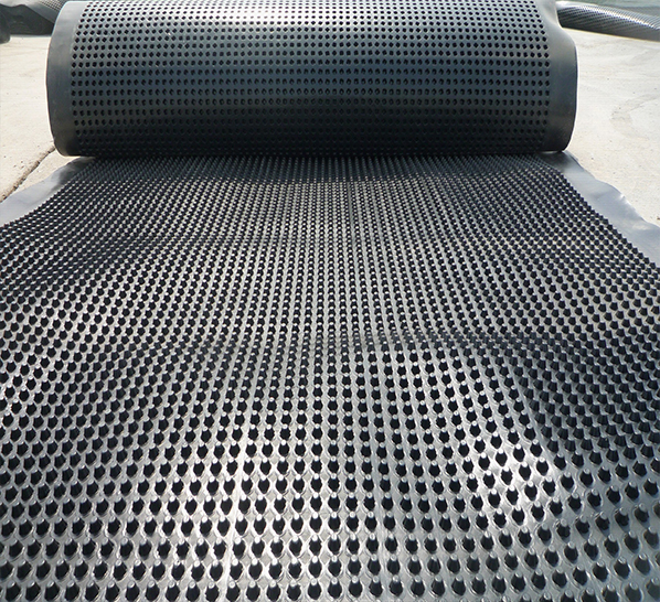 排水板是由聚苯乙烯(HIPS)或者是聚乙烯(HDPE)塑胶底板经过冲压制成圆锥突台或者加劲肋的凸点(或中空圆柱形多孔)而成,幅宽有3米,长度有10米或者是15米。